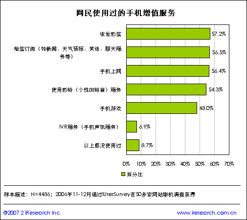 中國移動的增值業(yè)務(wù)已經(jīng)發(fā)展到一個相對成熟的階段,增值業(yè)務(wù)對整體業(yè)務(wù)的貢獻(xiàn)度有望進(jìn)一步提高,2006年中國移動增值收入比例達(dá)到23.5%。中國移動的增值業(yè)務(wù)收入構(gòu)成目前還比較單一,短信占主導(dǎo)。WAP/MMS/Java等2.5G業(yè)務(wù)將從2007年開始進(jìn)入高速發(fā)展階段,而CRBT和IVR則將逐漸進(jìn)入成熟期與調(diào)整期,增長速度趨緩。iResearch艾瑞市場咨詢通過對用戶研究發(fā)現(xiàn),彩信、短信、WAP、彩鈴及手機(jī)游戲最受用戶青睞,彩信、短信訂閱、手機(jī)上網(wǎng)、彩鈴及手機(jī)游戲是用戶使用最多的移動增值業(yè)務(wù)。