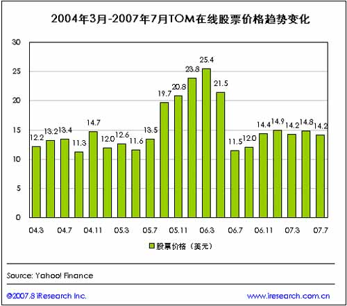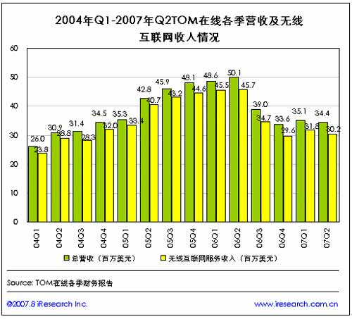 在2006年第二季度總營收以及無線互聯(lián)網(wǎng)服務(wù)收入分別達(dá)到歷史最高點(分別達(dá)到5010萬美元和4571萬美元)之后,TOM在線各季收入及無線互聯(lián)網(wǎng)收入呈逐季下滑趨勢,至2007年第二季度,TOM在線的總營收為3439萬美元,來自無線互聯(lián)網(wǎng)服務(wù)的收入為3024萬美元。