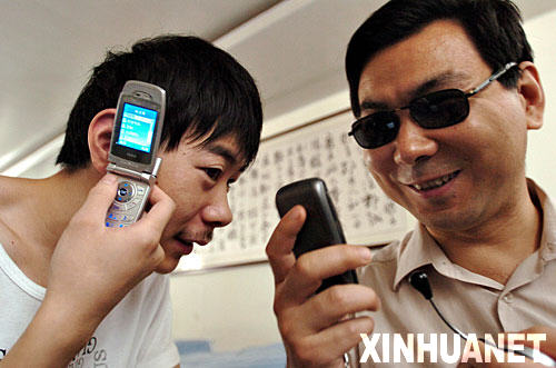 兩位盲人在用盲人專用手機收發(fā)短信