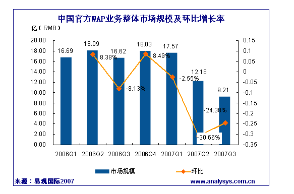 易觀國際研究表明,2007年第3季度中國官方WAP市場規(guī)模達(dá)到9.21億人民幣,同比下降44.57%。中國移動(dòng)WAP頁面“資費(fèi)提醒”政策對(duì)市場的影響已得到控制,與2季度WAP市場規(guī)模逐月遞減現(xiàn)象相比,2007年7月、8月、9月WAP市場規(guī)模呈現(xiàn)穩(wěn)步增長趨勢。中國聯(lián)通WAP市場規(guī)模為1.065億元,同比下降47.55%,自中國聯(lián)通四月份改實(shí)收結(jié)算后,信息費(fèi)一直呈現(xiàn)下降趨勢。通信產(chǎn)業(yè)網(wǎng)