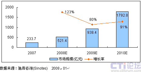 馳昂咨詢(Sinotes)發(fā)布的《2007-2008年中國3G后視頻應用市場研究報告》顯示,2007年,中國視頻應用市場規(guī)模為233.7億元,比2006年同期增長了84%,用戶規(guī)模近4800萬,比2006年的2300萬翻了一番。馳昂咨詢的分析師孟慶雯認為,這主要得益于產(chǎn)業(yè)鏈各方在利用現(xiàn)有2.5G/2.75G網(wǎng)絡開展視頻應用服務上做的有益嘗試。產(chǎn)業(yè)鏈各方的努力加快了3G視頻應用市場培育步伐,基本滿足了在現(xiàn)有網(wǎng)絡條件下用戶對視頻服務的需求,確保了由2.5G/2.75G向3G的業(yè)務銜接和過渡。