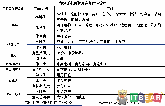 目前國(guó)內(nèi)市場(chǎng)上運(yùn)行的手機(jī)網(wǎng)游不下百種,單就手機(jī)網(wǎng)游開放來(lái)說(shuō),國(guó)內(nèi)還沒(méi)有哪家或哪幾家開發(fā)商控制占據(jù)絕對(duì)優(yōu)勢(shì)的局面。下表列出了幾家手機(jī)網(wǎng)游開發(fā)商開發(fā)的手機(jī)網(wǎng)游產(chǎn)品。從表中可以看出中科奧開發(fā)的產(chǎn)品數(shù)量較多(18款),主要產(chǎn)品為棋牌與休閑類小游戲。其他的開發(fā)商開發(fā)的手機(jī)網(wǎng)游產(chǎn)品數(shù)量在2—5款之間,多為大型游戲。從游戲品種的不同可以看出主要開發(fā)商的研發(fā)方向有所區(qū)別。
