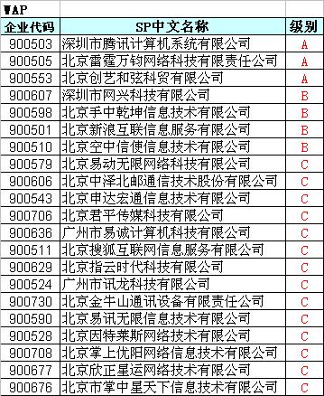 從榜單上可以看到,在短信業(yè)務(wù)上,北京星潮在線文化發(fā)展有限公司、北京雷霆萬鈞網(wǎng)絡(luò)科技有限責(zé)任公司和南京網(wǎng)典科技有限公司獲A評級。深圳市騰訊計算機系統(tǒng)有限公司、北京雷霆萬鈞網(wǎng)絡(luò)科技有限責(zé)任公司和北京創(chuàng)藝和弦科貿(mào)有限公司獲得WAP業(yè)務(wù)的A評級。
