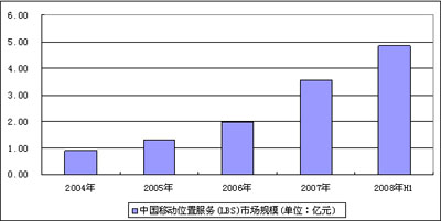 2008年上半年,LBS業(yè)界期盼已久的3G網(wǎng)絡(luò)終于進(jìn)入了試商用階段,盡管TD-SCDMA的試用過(guò)程中存在著諸多問(wèn)題,用戶(hù)感受不佳,但它畢竟為L(zhǎng)BS開(kāi)拓出一片廣袤的用戶(hù)市場(chǎng)。隨著中國(guó)移動(dòng)在TD方面的發(fā)力,以及電信重組之后, 3G牌照的發(fā)放,LBS市場(chǎng)必將呈現(xiàn)出高速發(fā)展之勢(shì)。圖 1 2003-2008年上半年中國(guó)移動(dòng)位置服務(wù)(LBS)市場(chǎng)規(guī)模