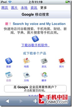 Google for iPhone的界面針對iPhone/ipod touch下的safari做了優(yōu)化,富客戶端在手持設備上,無論界面還是速度都達到近乎完美的地步。
