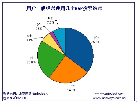 而從用戶最經(jīng)常使用的個數(shù)的調(diào)研中發(fā)現(xiàn),超過1/3的移動搜索用戶最經(jīng)常使用的WAP搜索僅為1個,此類用戶的忠誠度較高,一般對于使用的這一個WAP搜索站點的品牌較為認可,因而促使習(xí)慣性使用。而經(jīng)常使用2個或3個WAP搜索站點的用戶均有1/4。經(jīng)常使用超過4個的WAP搜索站點的用戶比例較小。易觀國際(Analysys