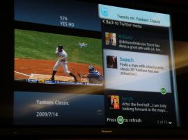 在使用電視窗件時,電視機(jī)屏幕將被分為左右兩塊,Twitter消息顯示在其中一個屏幕中。這一應(yīng)用在觀看重大事件或者體育賽事時可以帶來非常精彩的體驗。比如觀看紐約楊基隊的一場棒球比賽,用戶可以同時閱讀洋基隊有關(guān)的Twitter短消息。