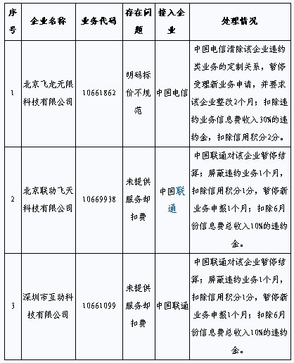 據(jù)悉,這3家增值電信企業(yè)是北京飛龍無限科技有限公司,存在明碼標價不規(guī)范問題;北京聯(lián)動飛天科技有限公司,未提供服務卻扣費;深圳市互動科技有限公司,未提供服務卻扣費。