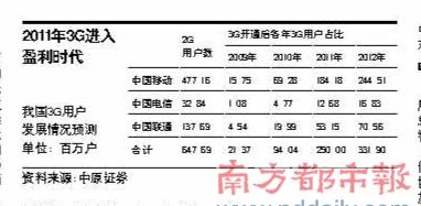 這是一場(chǎng)谷歌與蘋果之間的戰(zhàn)爭(zhēng),國(guó)內(nèi)的三大運(yùn)營(yíng)商則因?yàn)楦髯岳娴尿?qū)使,深深陷入其中,一方面,蘋果與聯(lián)通達(dá)成協(xié)議,iPhone(手機(jī)上網(wǎng))即將登陸中國(guó)。另一方面,中國(guó)移動(dòng)OMS操作系統(tǒng)機(jī)型oPhone也進(jìn)入了上市倒計(jì)時(shí)階段,昨日,本報(bào)從手機(jī)制造商內(nèi)部獲悉,最先推出的兩款G SM網(wǎng)絡(luò)oPhone戴爾M INI3i和多普達(dá)A6188已進(jìn)入量產(chǎn)鋪貨階段。至于中國(guó)電信,雖然移動(dòng)業(yè)務(wù)起步最晚,卻獲得了最快的用戶增速,然而,到目前為止,中國(guó)電信也還未能拿出一款可以與iPhone、oPhone一較高下的產(chǎn)品。圖:我國(guó)3G用戶發(fā)展情況預(yù)測(cè)