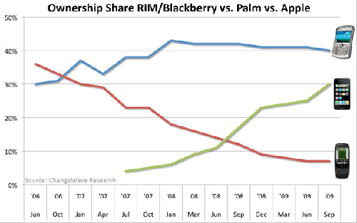 ChangeWave Research今年9月對(duì)4255名美國用戶進(jìn)行的調(diào)查顯示,其中39%擁有智能手機(jī),高于7月的37%,較去年同期幾乎翻番。雖然RIM黑莓仍然占據(jù)榜首,但是其市場(chǎng)份額增長已經(jīng)開始停滯,目前約為40%,與去年同期基本持平,而iPhone則保持了快速上升勢(shì)頭,由去年同期的不足20%,增長到現(xiàn)在的30%。