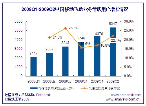 飛信用戶到達(dá)數(shù)的增長(zhǎng)帶來(lái)了活躍用戶的穩(wěn)步提升,截止到2009年第2季度,飛信活躍用戶達(dá)到了5347萬(wàn),與2008年同期相比增長(zhǎng)超過(guò)108.3%。由于一方面飛信到達(dá)數(shù)增長(zhǎng)環(huán)比從2008年第2季度持續(xù)下跌,在2009年第2季度才止跌反彈,相比另一方面飛信活躍用戶的增長(zhǎng)環(huán)比始終保持在15%以上,且從2008年第4季度開始飛信活躍用戶增幅持續(xù)擴(kuò)大,因此近期飛信業(yè)務(wù)用戶活躍度表現(xiàn)出良好的增長(zhǎng)勢(shì)頭。