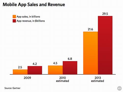 美國市場研究公司Gartner的最新數據顯示,2009年全球手機應用銷售額高達42億美元。以銷量計算,蘋果占據99.4%的市場份額。