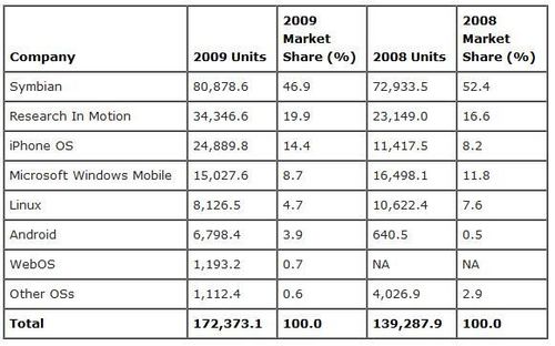 2009年各手機(jī)操作系統(tǒng)銷售情況