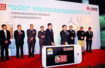 圖:為上海市常務副市長楊雄、中國移動副總裁李正茂共同啟動“世博通”手機錢包軌道交通應用。