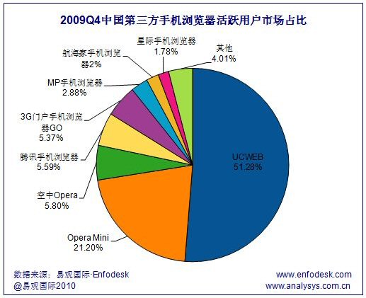 易觀國際(Analysys International)分析認(rèn)為,2009年4季度中國手機(jī)瀏覽器市場隨著騰訊、3G門戶等實力強(qiáng)勁的廠商發(fā)力,搶占用戶的市場競爭變得日漸激烈。處于不同手機(jī)瀏覽器陣營的廠商都紛紛通過技術(shù)改進(jìn)與大力度的市場營銷廣泛推廣自有產(chǎn)品。