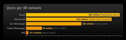 用戶最多的即時(shí)通訊工具包括:Skype(5.6億注冊用戶)、騰訊QQ(5.22億活躍用戶帳戶)、MSN(3.3億活躍用戶)、雅虎通(9400萬用戶--2007年數(shù)據(jù))。