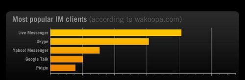 根據(jù)wakoopa.com的數(shù)據(jù),全球最受歡迎的即時(shí)通訊客戶端依次為:MSN、Skype、雅虎通、GTalk、Pidgin。