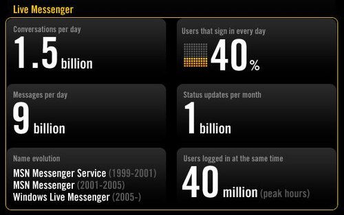 關(guān)于微軟MSN的數(shù)據(jù)為:每天產(chǎn)生的溝通次數(shù)為15億,每天產(chǎn)生的消息為90億條。每月簽名檔消息更新量為10億條。每天都登陸的用戶比例為40%,同時(shí)在線人數(shù)最高值為4000萬。