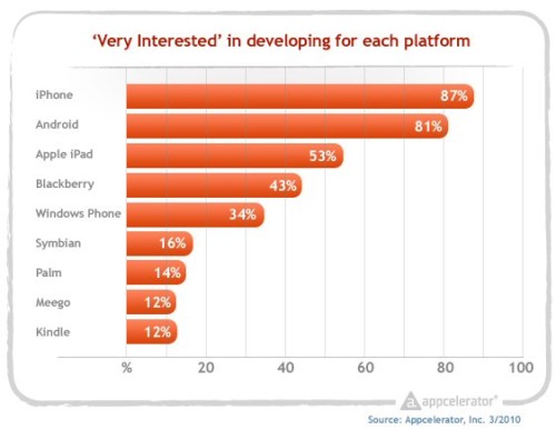 根據(jù)報道,在2010年1月,有86%的開發(fā)者非常有興趣開發(fā)iPhone應(yīng)用程序,而68%的開發(fā)者非常有興趣開發(fā)Android程序,差距是18%。而在3月時,這個差距縮小到6%(iPhone 87%、Android 81%,iPad是53%)。