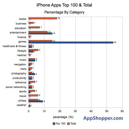 下圖是iPhone和iPod touch的Top100軟件(藍(lán)色)與軟件總數(shù)量(橙色)在各個(gè)軟件類別中的分布比例。可以看出: