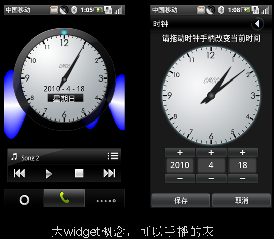 第三,引入大widget概念。Widget給用戶提供了簡易接口來執(zhí)行一些常用功能。OPhone2.0版本首次引入了大widget概念,將手機(jī)人性化操作提升到了新的高度。譬如,手機(jī)最簡單也是最常用的顯示時間功能,就在OPhone2.0中被設(shè)計成了一個“可以用手播動的表”,用戶不必再繁瑣地輸入數(shù)字來修改時間。
