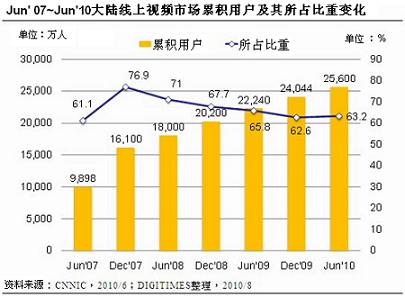 據(jù)中國互聯(lián)網(wǎng)絡(luò)信息中心(CNNIC)調(diào)查,至2010年6月,中國在線視頻用戶已達(dá)2.5億,所占比重是4.2億網(wǎng)絡(luò)用戶的63.2%;據(jù)易觀國際統(tǒng)計(jì),2009年中國在.線視頻市場(chǎng)規(guī)模達(dá)人民幣8.44億元,較2008年成長(zhǎng)95.4%,其在使用人口及市場(chǎng)規(guī)模表現(xiàn),成為各方爭(zhēng)奪之地。