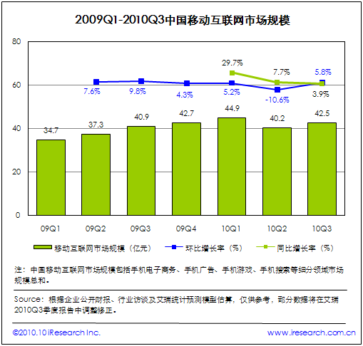 艾瑞:2010Q3中國移動(dòng)互聯(lián)網(wǎng)市場(chǎng)規(guī)模小幅增長