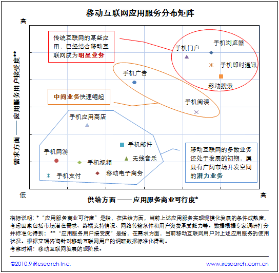 根據(jù)艾瑞咨詢近期發(fā)布的《2009-2010年中國(guó)移動(dòng)互聯(lián)網(wǎng)行業(yè)發(fā)展報(bào)告》,移動(dòng)互聯(lián)網(wǎng)各應(yīng)用服務(wù)在“應(yīng)用服務(wù)商業(yè)可行度”和“應(yīng)用服務(wù)用戶接受度”兩個(gè)維度上被劃分為“明星業(yè)務(wù)”、“中間業(yè)務(wù)”和“潛力業(yè)務(wù)”三個(gè)類型。具備一定規(guī);l(fā)展市場(chǎng)條件,但還面臨若干限制因素的移動(dòng)互聯(lián)網(wǎng)業(yè)務(wù),將在未來逐步打開市場(chǎng)。