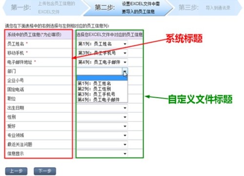 系統(tǒng)將自動(dòng)讀取上傳的文件標(biāo)題并在頁(yè)面右邊列表顯示上傳文件中的全部標(biāo)題名稱(即自定義文件標(biāo)題),通過(guò)與左邊系統(tǒng)標(biāo)題的對(duì)應(yīng)后,點(diǎn)擊“下一步”按鈕即可進(jìn)行第三步的操作。