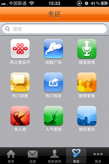 記者在測試中發(fā)現(xiàn),聯(lián)通語音微博整體界面為醒目的聯(lián)通標準色,并內(nèi)置了聯(lián)通專區(qū)、聯(lián)通網(wǎng)上營業(yè)廳、廣東聯(lián)通炫魅廣東等定制應(yīng)用服務(wù)。