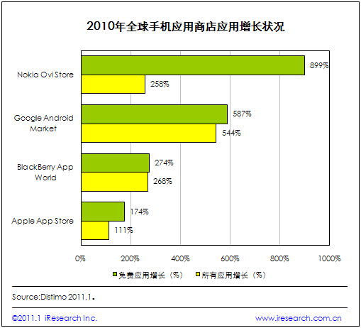 iResearch艾瑞咨詢整理Distimo最新公布數(shù)據(jù)發(fā)現(xiàn),2010年全球手機(jī)應(yīng)用商店免費(fèi)應(yīng)用大幅增長。數(shù)據(jù)表明,諾基亞Ovi Store免費(fèi)應(yīng)用增長速度最快,增長率為899%,谷歌Android Market和RIM的BlackBerry App World次之,增長率分別為587%和274%.艾瑞咨詢