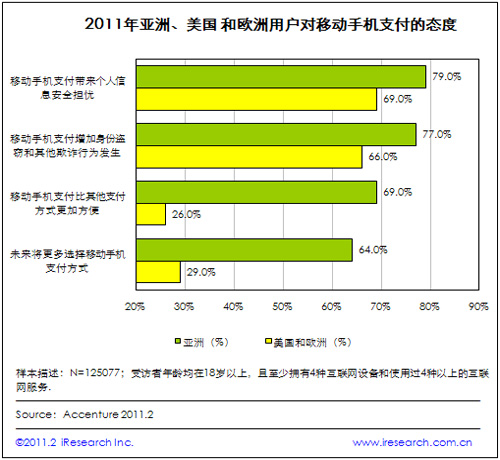 iResearch艾瑞咨詢根據(jù)Accenture的研究調(diào)查數(shù)據(jù)發(fā)現(xiàn),移動手機支付安全問題受到全球用戶的普遍關(guān)心。根據(jù)2011年Accenture對亞洲、美國以及歐洲125077位手機用戶進(jìn)行的網(wǎng)上調(diào)查顯示,亞洲79%的受訪者擔(dān)心移動手機支付帶來的個人信息安全隱患,77%的受訪者擔(dān)心身份盜竊和其他欺詐行為的發(fā)生;美國和歐洲擔(dān)心以上安全問題的用戶也分別占到69%和66%。艾瑞咨詢