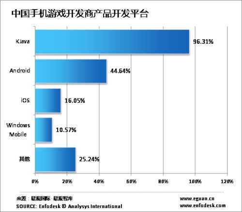 根據(jù)易觀國(guó)際的數(shù)據(jù)顯示,截至2010年底,中國(guó)手機(jī)游戲用戶規(guī)模突破1.3億,同比增長(zhǎng)52.11%,同期中國(guó)手機(jī)游戲市場(chǎng)規(guī)模達(dá)33億,伴隨著整體市場(chǎng)的發(fā)展手機(jī)游戲開(kāi)發(fā)商隊(duì)伍也逐漸完善;為了更好的研究手機(jī)游戲市場(chǎng),近期易觀國(guó)際對(duì)手機(jī)游戲開(kāi)發(fā)商進(jìn)行調(diào)研,推出《中國(guó)手機(jī)游戲開(kāi)發(fā)商研究報(bào)告2010》,以期對(duì)手機(jī)游戲市場(chǎng)提供有價(jià)值的信息,通過(guò)調(diào)研發(fā)現(xiàn)KJava依舊是中國(guó)手機(jī)游戲開(kāi)發(fā)商的主要開(kāi)發(fā)平臺(tái)。CTI論壇報(bào)道