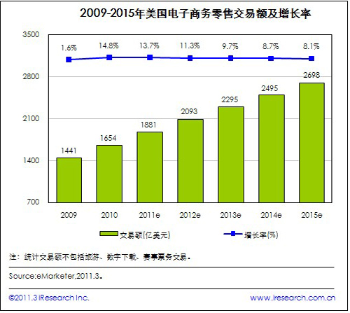 iResearch艾瑞咨詢根據(jù)美國商務部公布的數(shù)據(jù)發(fā)現(xiàn),2010年美國電子商務零售市場實現(xiàn)金融危機以來的首次強勁復蘇,其銷售額達1654億美元,較2009年同比增長14.8%。同時,根據(jù)eMarketer的美國電子商務零售預測模型獲得的數(shù)據(jù)顯示,2011年美國電子商務零售交易額將達到1881億美元。隨著電子商務的不斷成熟,一直到2015年期間美國電子商務零售交易額將保持穩(wěn)定健康的增長,且增長率趨于持續(xù)小幅降低。艾瑞咨詢