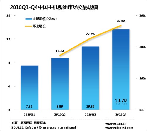 2010年是中國手機購物市場的元年。淘寶網(wǎng)、京東商城、卓越亞馬遜等平臺已經(jīng)紛紛搭建了自己的手機購物平臺,包括WAP和客戶端模式。而買賣寶等獨立手機購物平臺的發(fā)展也引人注目。雖然支付瓶頸尚未解決,但是三四線城市以及務(wù)工群體手機購物的需求還是爆發(fā)于手機支付手段成熟的前夜。