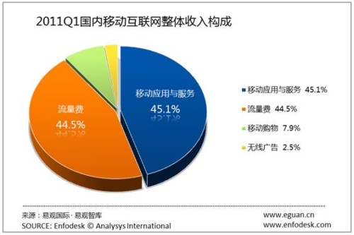從2011年第1季度移動(dòng)互聯(lián)網(wǎng)收入構(gòu)成,我們發(fā)現(xiàn)移動(dòng)應(yīng)用與服務(wù)仍然是主要營(yíng)收,占總體市場(chǎng)的45.13%。而流量費(fèi)依然占據(jù)44.45%的份額。而移動(dòng)購(gòu)物,無(wú)線廣告營(yíng)收占比增長(zhǎng)有限,分別占7.89%和2.52%。