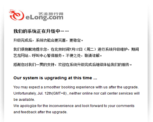 藝龍?jiān)庥龃鎯?chǔ)故障服務(wù)中斷20小時(shí) 呼叫中心暫停服務(wù)