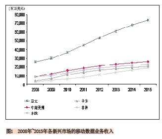 我們預(yù)測,2015年新興市場運(yùn)營商的移動數(shù)據(jù)業(yè)務(wù)收入將達(dá)到1620億美元,在2010年這一數(shù)字只有834億美元,5年間的復(fù)合年均增長率將達(dá)到14%,總體增長率為94%。顯而易見的是,移動數(shù)據(jù)業(yè)務(wù)將快速發(fā)展,未來將成為運(yùn)營商制勝新興市場的關(guān)鍵。