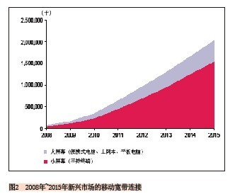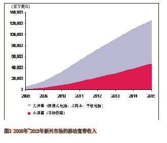 另外一個(gè)預(yù)測也可說明這一趨勢:2010年到2015年小屏幕移動寬帶連接的復(fù)合年均增長率為45%,而大屏幕的復(fù)合年均增長率為36%,到2015年新興市場上將有16億的小屏幕連接和近4.59億的大屏幕連接。