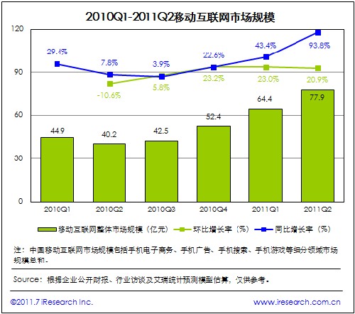 2011Q2中國移動(dòng)互聯(lián)網(wǎng)市場規(guī)模達(dá)77.9億元