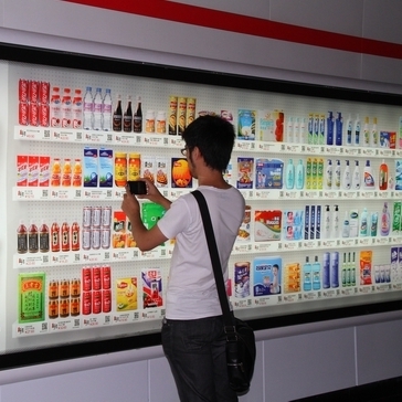 這種虛擬商店消費(fèi)模式如今正漂洋過(guò)海而來(lái),北京移動(dòng)此前就曾推出過(guò)麥當(dāng)勞電子兌換單服務(wù),用戶可以通過(guò)短信接收二維碼,再去麥當(dāng)勞門店掃描兌現(xiàn)。而細(xì)心的申城用戶如今也能在軌交過(guò)道中發(fā)現(xiàn)這樣的虛擬百貨商店廣告,這些燈箱廣告中出現(xiàn)了超市中才能見到的商品貨架,五顏六色的商品圖案讓人仿佛置身于大型超市一樣,但只有當(dāng)你走近才會(huì)發(fā)現(xiàn)“貨架”竟然是“貼”在墻上的,從零食到衣服,甚至還有尿片,這里每一種產(chǎn)品下方都有相應(yīng)價(jià)格和二維碼。
