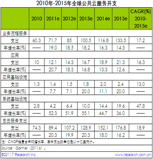 iResearch艾瑞咨詢整理Gartner的最新數(shù)據(jù)研究發(fā)現(xiàn),預計全球公共云服務市場支出將從2010年的700億美元上漲到2015年的1800億美元,期間的年均增長率為18.9%,為同期IT業(yè)整體支出年均增長率的4倍。盡管如此,到2015年,在公共云服務上的支出仍不足IT整體支出的5%。近來,公共云服務在IT業(yè)界內是最熱門的話題,這種類型的云服務通常遍布整個因特網(wǎng),能夠服務于幾乎不限數(shù)量的、擁有相同基本架構的客戶。艾瑞咨詢