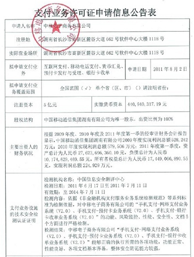 中移動(dòng)申請支付業(yè)務(wù)許可證 湖南移動(dòng)全資運(yùn)營