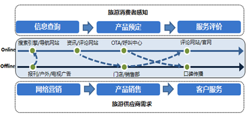 從旅游供應(yīng)商的維度出發(fā),缺失的兩個(gè)環(huán)節(jié)往往對其訂單生成有決定性意義。一方面是在網(wǎng)民獲取旅游信息的環(huán)節(jié)借助互聯(lián)網(wǎng)展示及搜索廣告進(jìn)行品牌曝光及活動(dòng)營銷,提升企業(yè)的品牌知名度及銷售轉(zhuǎn)化率。另一方面是在網(wǎng)民針對旅游服務(wù)進(jìn)行評(píng)價(jià)及分享的環(huán)節(jié)及時(shí)解答服務(wù)疑問引導(dǎo)評(píng)論主題,通過口碑因素提高老用戶APRU值并帶來新用戶。