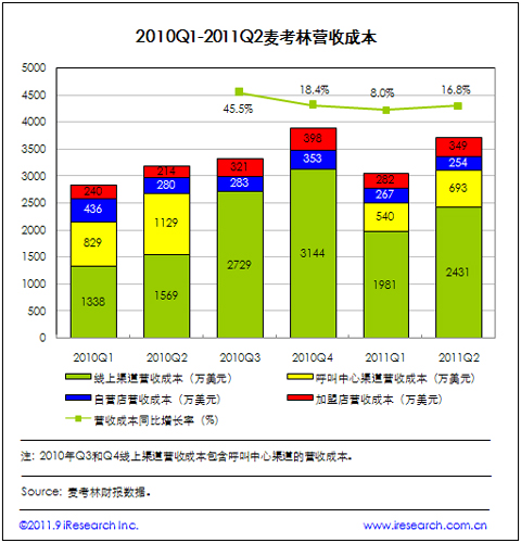 2011Q2凈營收為5873萬美元,與2010年同期持平,其中線上渠道凈營收3271萬美元,占凈營收的55.7%,同比增長25.9%,呼叫中心渠道凈營收1480萬美元,占比25.2%,實(shí)體店渠道凈營收1122萬美元,占比19.1%;營收成本方面,2011Q2為3728萬美元,同比上升16.8%,其中線上營收成本為2431萬美元,占比65.2%,同比增長55%。