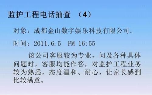 楊靜一稱,在金山客服中心有句常用語(yǔ):“一切以用戶滿意為中心”,即玩家的權(quán)益是第一位的?头䦂F(tuán)隊(duì)通過(guò)多元化的服務(wù)渠道,提供普通坐席、專家坐席、投訴專崗來(lái)分類保障用戶各類需求;而珠?头植康脑O(shè)立,在處理玩家問(wèn)題方面,能與研發(fā)同事達(dá)成高度一致性,在最短時(shí)間內(nèi)針對(duì)游戲問(wèn)題做出反應(yīng)。今年9月,客服團(tuán)隊(duì)獲得了文化部領(lǐng)導(dǎo)在家長(zhǎng)監(jiān)護(hù)方面的表?yè)P(yáng)。