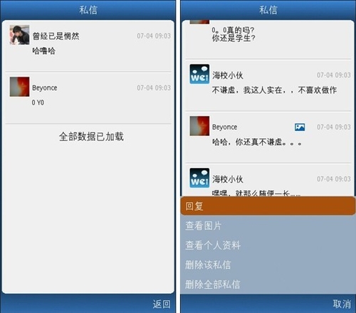 武俠小說中每每寫到傳音時(shí),都愛這樣寫“不世高人傳音入密……”。這不世高人的稱號可是讓人夢寐以求啊。語音微博1.6 for Symbian最新加入的私信功能助你一償夙愿。每每查看其他用戶以及他的語音微博時(shí),你都可以看到私信按鈕,點(diǎn)擊即可發(fā)送私信。傳音入密就是這樣簡單。當(dāng)然,除了語音,你也可以傳送文字,很貼心有木有。