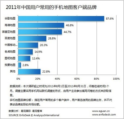 CTI論壇(ctiforum)11月25日消息(記者 潘婷婷): 據(jù)EnfoDesk易觀智庫最新發(fā)布的《2011中國手機地圖導(dǎo)航用戶調(diào)研報告》顯示,谷歌地圖、高德地圖及諾基亞地圖分別以87.6%、46.8%及44.7%的份額,占據(jù)2011年用戶最常用的手機地圖客戶端品牌份額(指在用戶常用的多個客戶端中,用戶首選使用的品牌比例,并不代表該品牌實際的市場份額,實際市場份額參見《2011年第3季度中國手機地圖客戶端市場監(jiān)測報告》)前三名的位置。CTI論壇報道