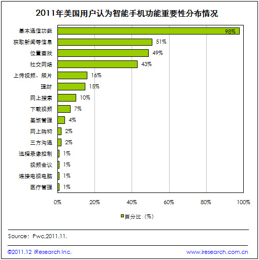 艾瑞咨詢根據(jù)Pwc近日發(fā)布的美國移動互聯(lián)網(wǎng)用戶演變研究報告發(fā)現(xiàn),用戶對移動設備的使用和依賴程度增強,同時,通過對用戶使用智能手機功能的調查發(fā)現(xiàn),用戶認為最重要的功能主要集中在基本通信、獲取資訊信息、位置查找和社交網(wǎng)絡上。艾瑞咨詢