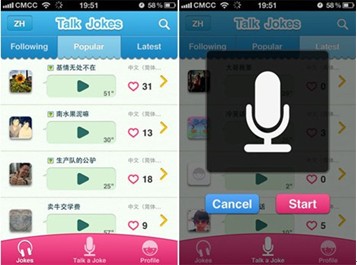 Talk Jokes是一款輕量級(jí)語(yǔ)音笑話分享應(yīng)用,鼓勵(lì)用戶通過真人錄音的方式上傳和分享自己的笑話,專注于“講笑話”的這部分語(yǔ)音垂直市場(chǎng)。